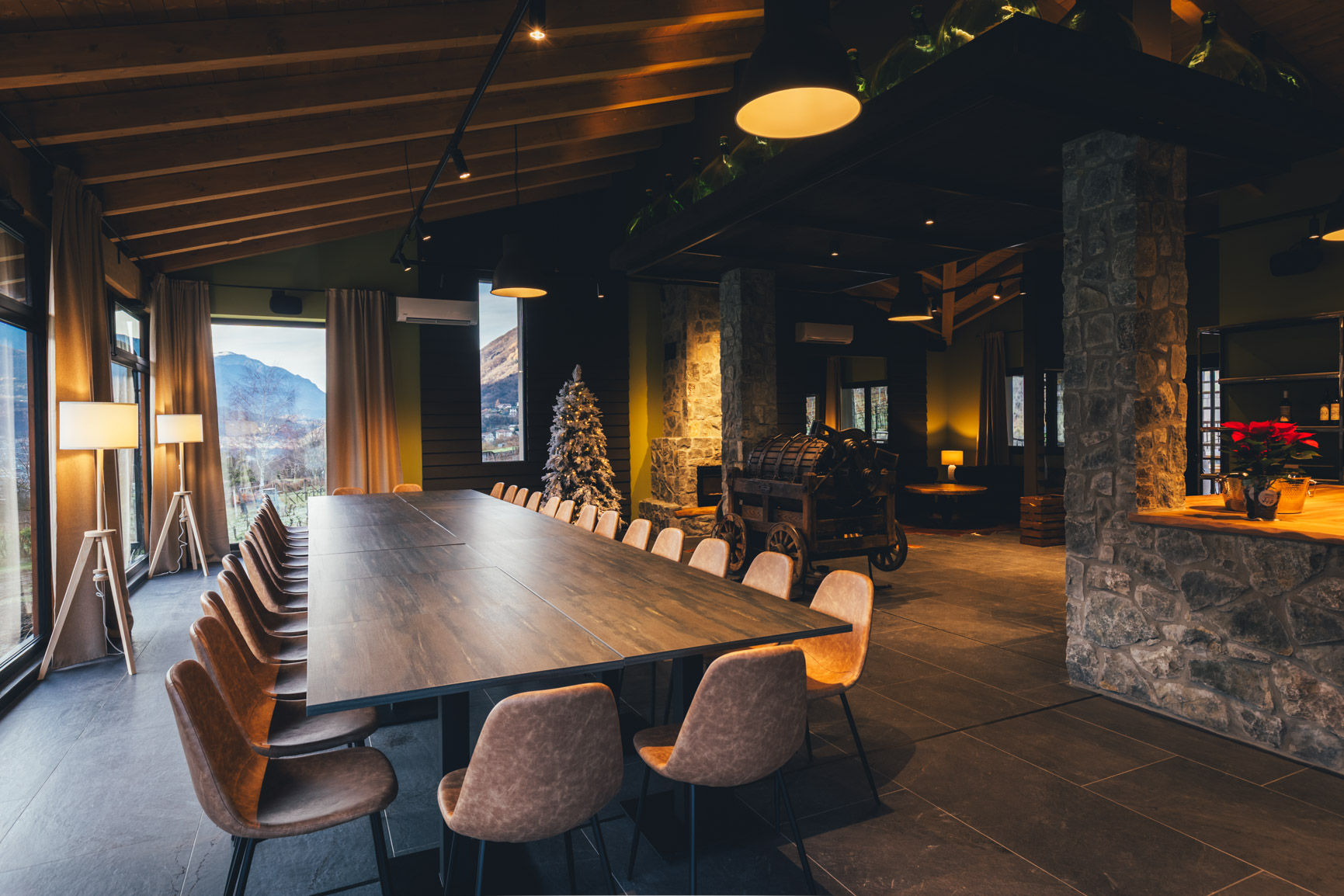 Le grandi vetrate regalano una vista che non stanca mai: i profili delle montagne, il Pizzo Badile che veglia silenzioso, la luce che cambia durante il giorno.